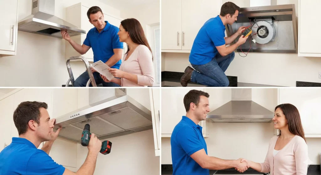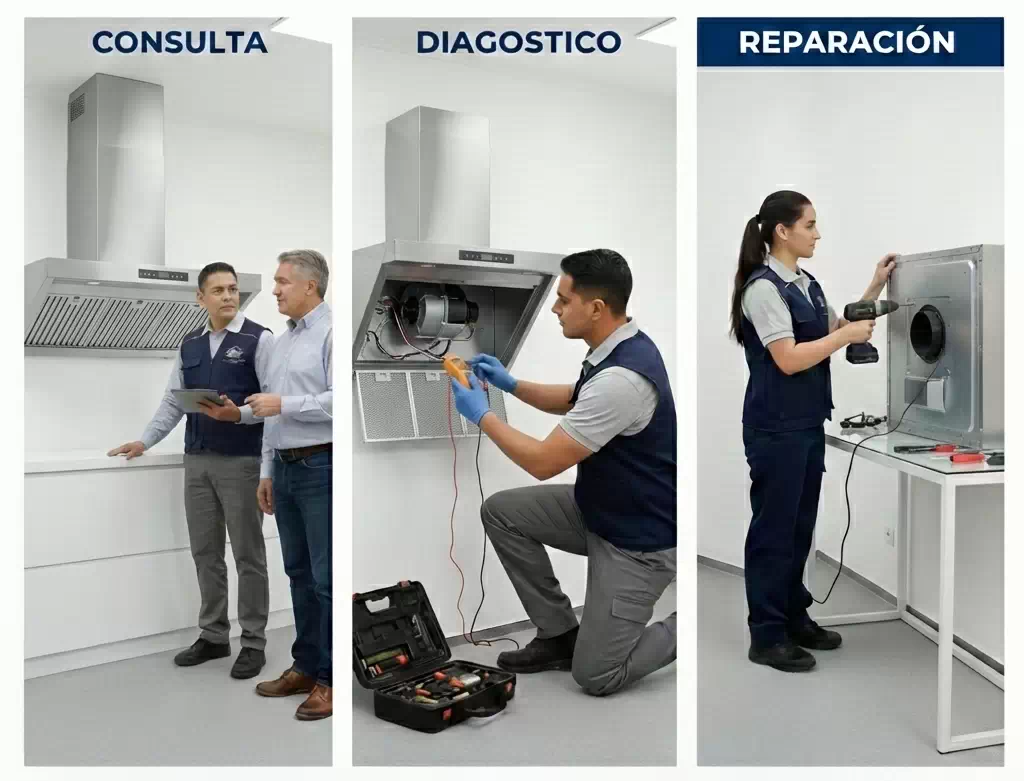 Atendemos: campana que no succiona, ruidos fuertes, motor débil, no enciende, fallas eléctricas, luces dañadas o acumulación de grasa. Dejamos el sistema operativo y recomendamos mantenimiento preventivo.